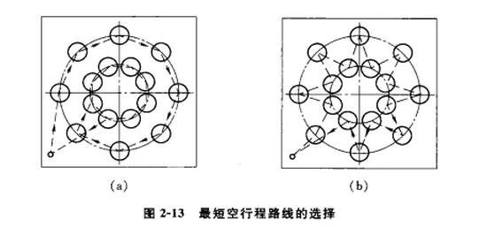 ?、诤侠戆才趴招谐踢\(yùn)動(dòng)路線 要加工如圖2-13所示的16個(gè)孔,按一般規(guī)律是先加工均布在同一圓周上的8個(gè)孔,再加工另一圓周上的孔(見圖2-13a),但對(duì)點(diǎn)位控制的數(shù)控機(jī)床來(lái)說(shuō),這并不是*短的空行程路線,如按圖2-13b所示的空行程路線進(jìn)行加工,則空行程距離的總和*小,因此可以提高生產(chǎn)率。